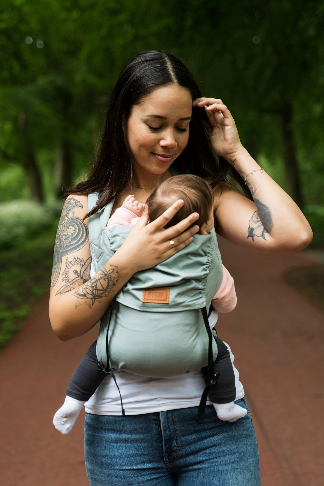 De Click Carrier Deluxe heeft een stevige foam buikband, een handig slaapkapje en los bijgeleverde voetsteuntjes die zorgen voor een ergonomische M-positie bij de grotere kinderen. Een koordje in de nek zorgt voor optimale nekondersteuning. Ook heeft de draagzak een verstelbaar rugpand, zodat hij een perfecte pasvorm heeft voor pasgeborenen, maar ook voor grotere kinderen. De banden zijn mooi weg te werken door middel van de elastiekjes aan de uiteinden. Je kunt de Click Carrier Deluxe eenvoudig en zonder hulp om doen.