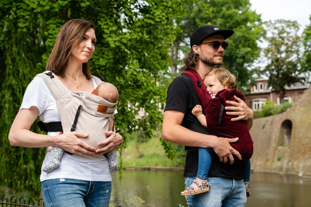 De Click Carrier Deluxe is tot in detail ontworpen en oogt een stuk luxer dan de meer eenvoudige versie van deze draagzak, de Click Carrier Classic. De Click Carrier Deluxe is af te stellen door middel van banden en clips en een koordje. Bij de Click Carrier Classic doe je dit door middel van het rugpand op te rollen en met het bijgeleverde bandje te versmallen.
