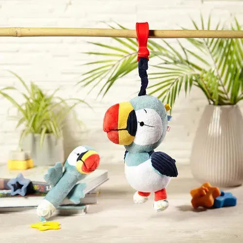 Das Toucan Titi Spielzeug lässt Ihr Kind eine vielfältige Welt von Farben, Geräuschen und Formen entdecken. Dank des universellen Hakens ist das Spielzeug für jeden Typ von Autositz oder Kinderwagen geeignet und kann Ihr Kind auf Reisen und Spaziergängen begleiten.