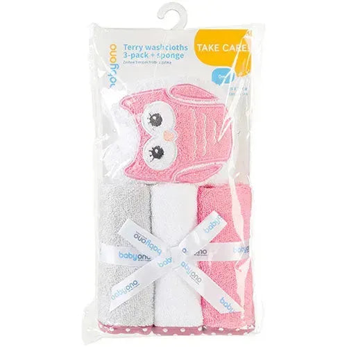 3 pieces of washcloths with a sponge - essential from the first bath. This set is useful during bath time and in daily use, for example, to wipe the baby's hands and face during the day. Made of high-quality, fluffy 100% cotton, so it does not irritate the delicate skin of the baby. It is packaged in a transparent, hangable box.