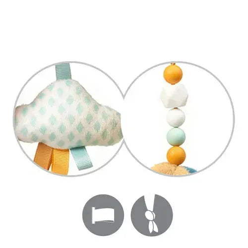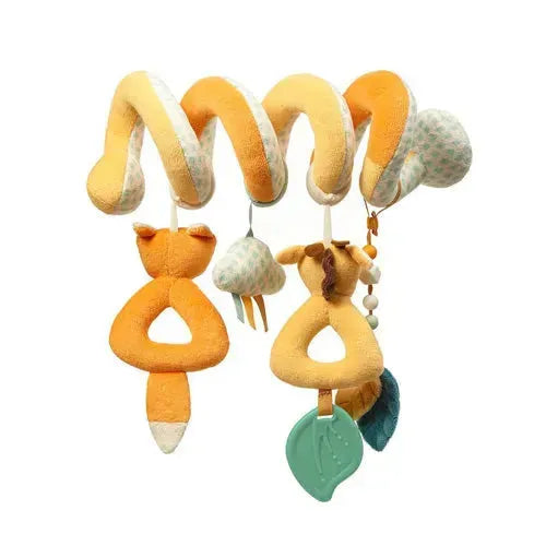 The educational spiral toy Skinny Mates introduces your child to a diverse world of colors, sounds, and shapes. Due to its spiral shape, the toy can be attached to all types of car seats or strollers, allowing it to accompany the child during travel and walking.