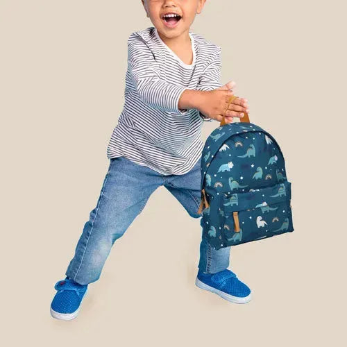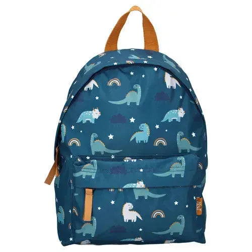 Let your child's imagination run wild with these fun backpacks from the 'Imagination' collection! This collection features backpacks for little ones with magical colorful animal prints. This backpack showcases cool dinosaurs. The backpack has a spacious front pocket where your child can store all their belongings. The bag is dark blue in color and finished with light blue and brown details. The shoulder straps are adjustable, and the zippers make it easy to open and close the bag. This way, a child can put all their toys or sleepover items in the large main compartment!