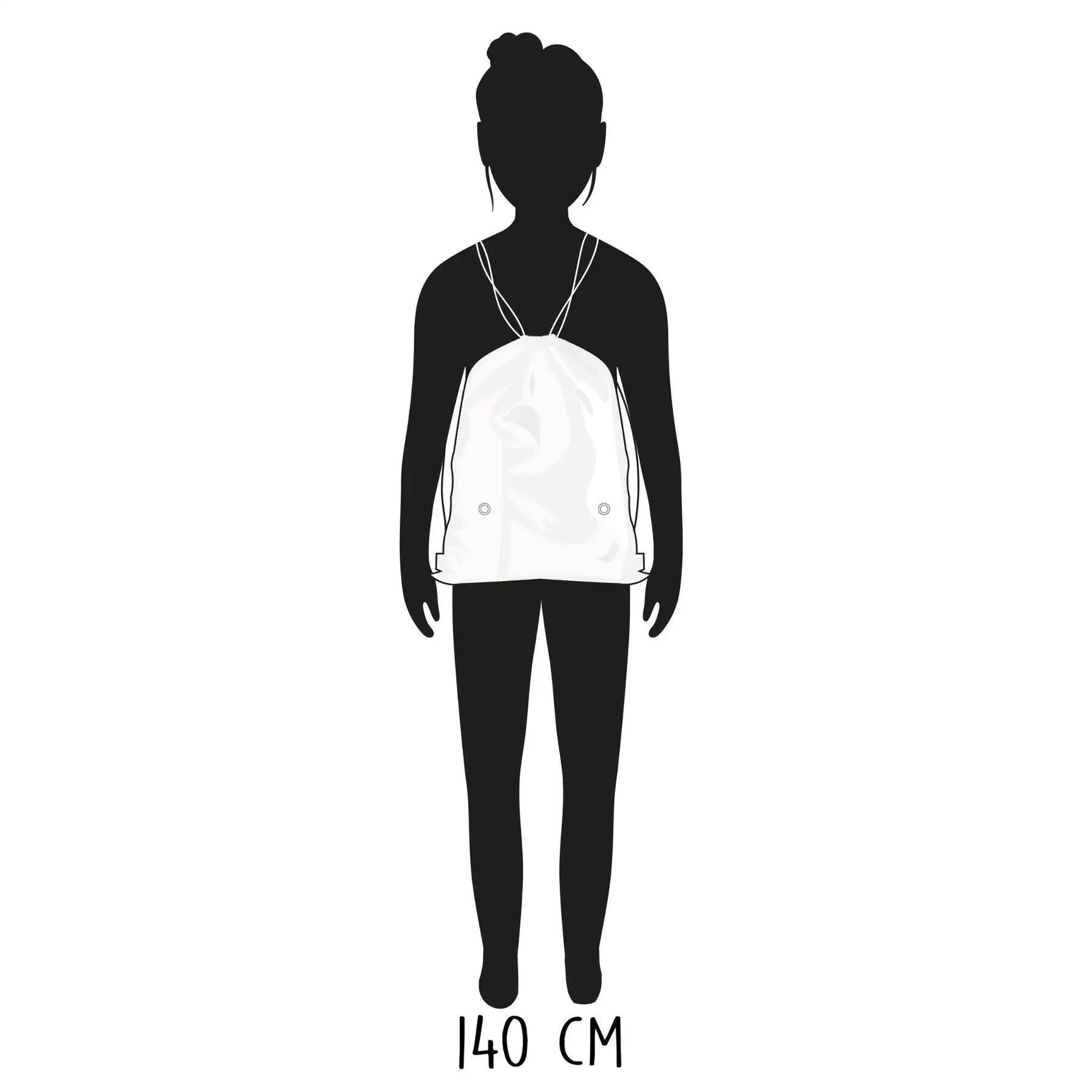 Kind met gymtas op de rug, lengte 140 cm, zwart-wit illustratie, kindermode