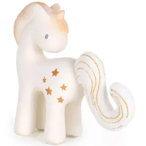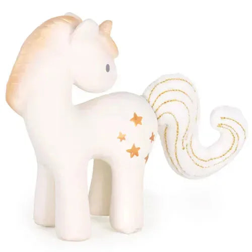 Shining Stars Unicorn uit onze Tikiri Fairytales collectie. Gemaakt van 100% natuurlijk rubber, de eenhoorn een fijn bijtspeeltje en rammelaar voor de kleintjes die gewoon leren om te verkennen! Het is gemakkelijk vast te houden voor kleinere handjes en stimuleert de baby's bij het ontdekken van hun zintuigen. De staart van de eenhoorn is van knisperend katoen.